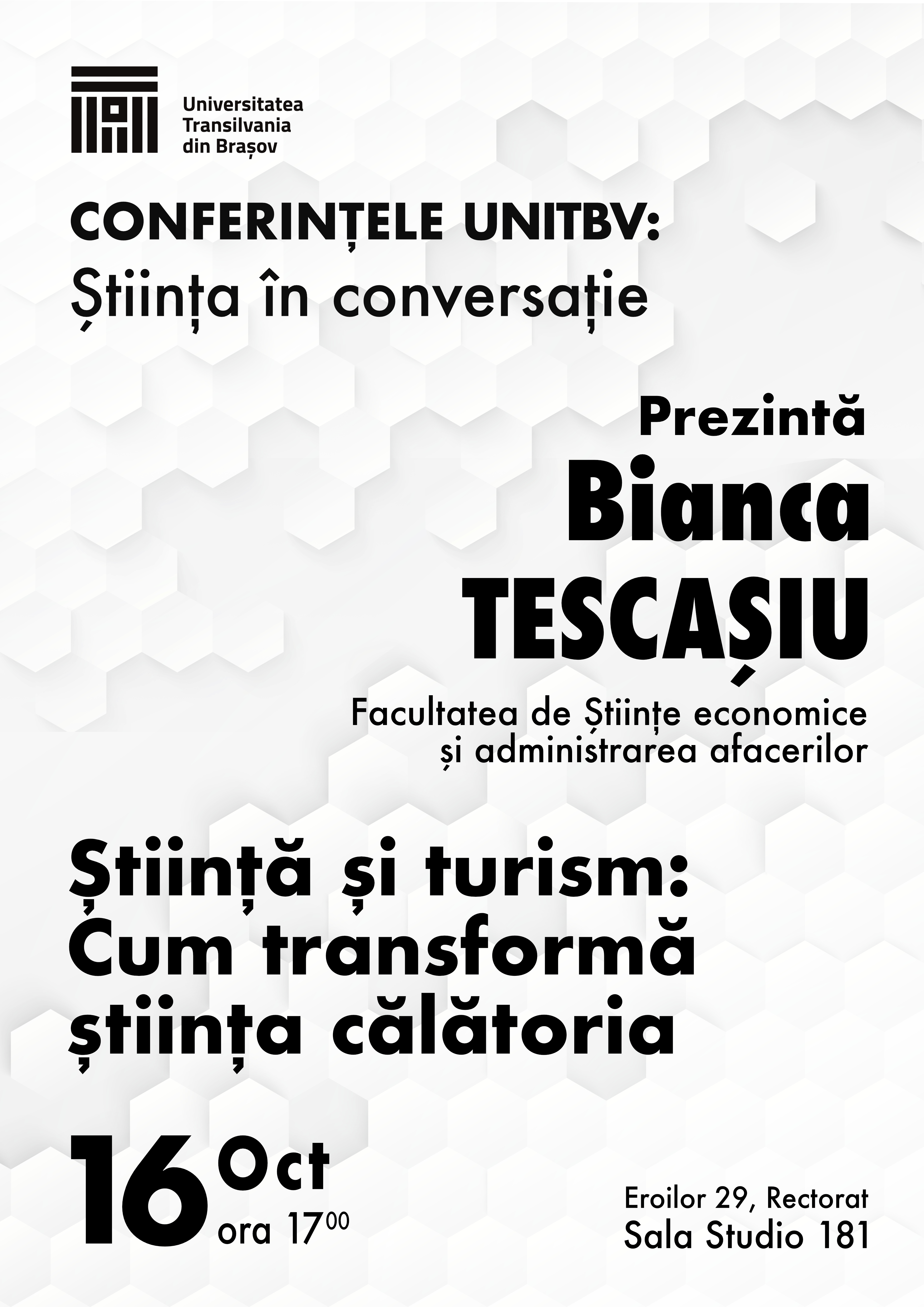Transilvania University of Brașov continues the series UNITBV Conferences: Science in Conversation. The guest of the sixth edition is Bianca Tescașiu, professor at the Faculty of Economic Sciences and Business Administration, who will be welcoming you at an engaging debate themed on Science and Tourism: How Science Enhances Travel.